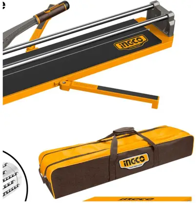 Tile cutter Max cutting length:600mm Max cutting thickness:16mm Aluminum die cast handle Solid sedan lods Net weight: 10kg Steel base size : 820X200mm Blade size:22x6x2mm Tungsten carbide ball bearing blade With 1 pcs bag Extra-long aluminium sliders Multi-function:direct line cutting, diagonal line cutting Diameter of sliding bar:20mm Packed by color box